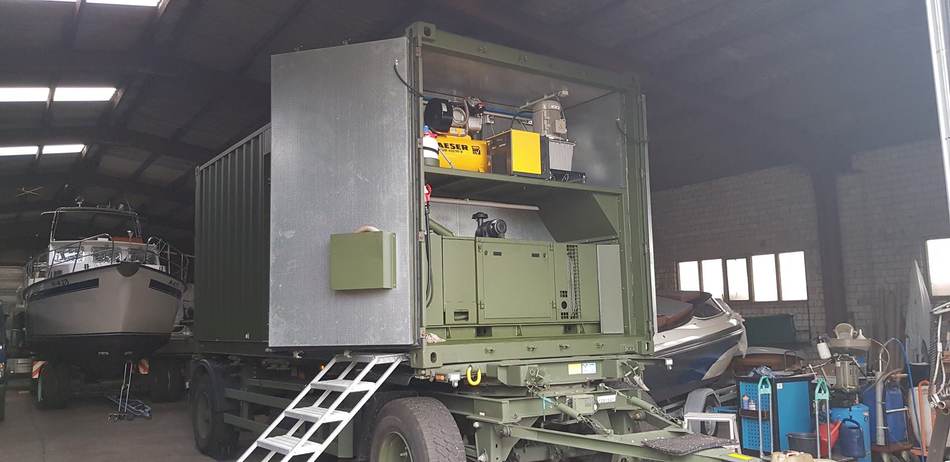 Generatoren mit Schalldämmkapsel und integriertem, wassergekühlten Vor- und Nachschalldämpfer.